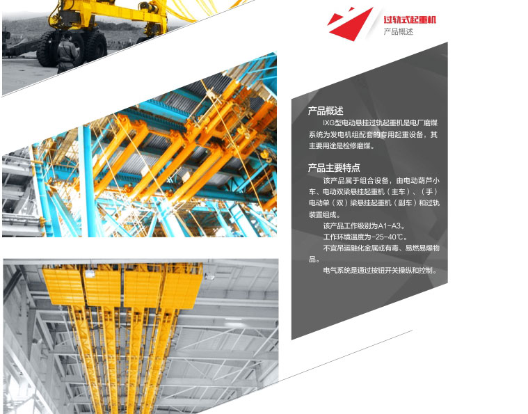 1、 XG型電動(dòng)懸掛過(guò)軌起重機(jī)是電廠磨煤系統(tǒng)為發(fā)電機(jī)組配套的專用起重設(shè)備,其主要用途是檢修磨煤。