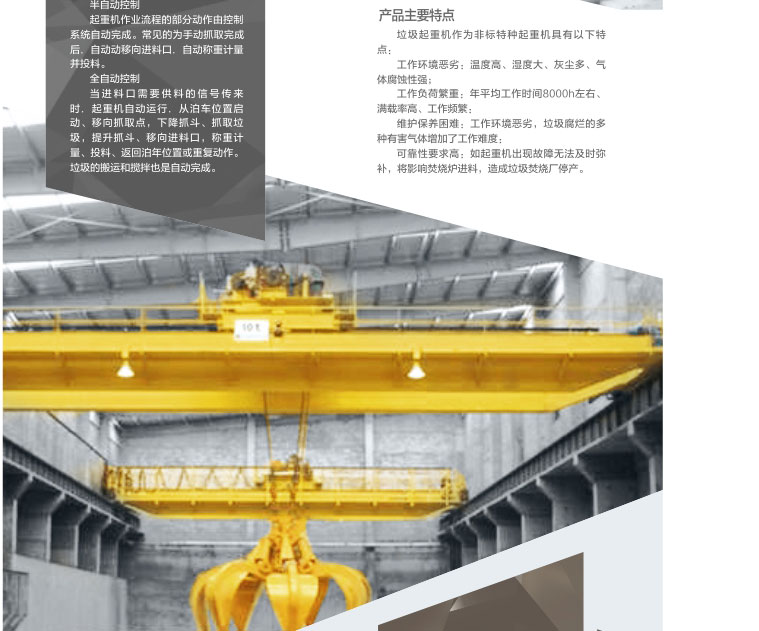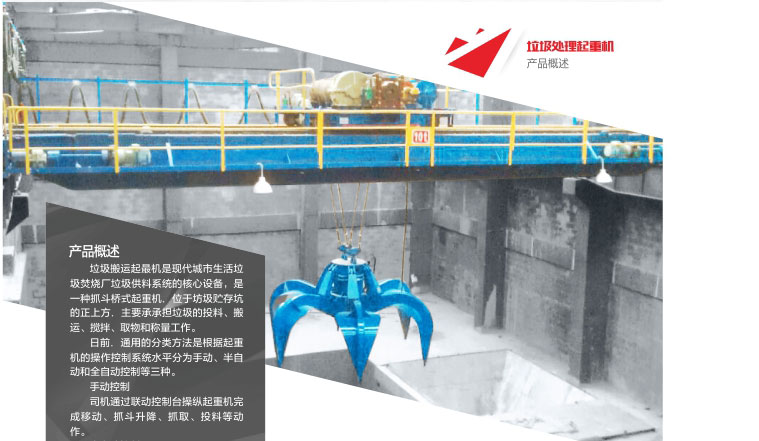 1、 垃圾抓斗起重機是現(xiàn)代城市各種垃圾焚燒發(fā)電廠垃圾供料系統(tǒng)的核心設(shè)備,位于垃圾儲存坑的上方,主要承擔(dān)對垃圾的投料、搬運、攪拌、取物和稱重等作業(yè)。
